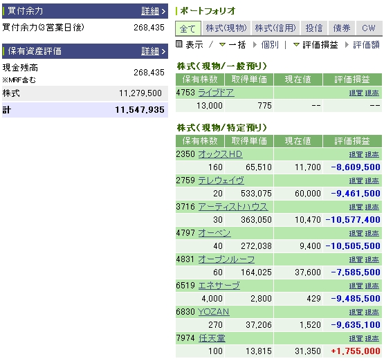 こんばんわ><へたれ王子です!!朝は好調でしたが、ロンドンから雲行きあやしくなりユロドル↑にいっちゃいました・・・うがあ><マイナスずいぶん増えましたね。。。うがあああああああああ ドル円ですが121.36Lでエントリーしてみました。121円台は崩れていないので122円抜けるの期待したいですね^-^ ユロドルですがそろそろアホールドするのも飽きてきました。1.3067来たら一時、撤退LCします。そして気分を取り直してドル円でがんがりたいです!!また1.29台もどしましたら激しく1.28応援します。でも、下値がきり上がってるからなあ汗 ポジ 121.36L×10枚 1.2786S×50枚 ここからは株についてはなしたいと思います。上のゴルフパートナーがマザーズで上場するというのでびっくりしました。この会社は中古ゴルフクラブのリサイクル販売とかをやっているのですが、直営店、FC店230店舗あるみたいですが、FC店の7割は赤字なんですよね。 以前、友人の税理士さんがFC店の帳簿を頼まれてひどい業務形態に憤慨していました。私にあの会社はふざけているので潰れたほうがいいといっていたので覚えていたのです。 でも、なんでそんな会社が上場できるんだ?きっと粉飾決算して上場していますね。そもそも、中古ゴルフクラブ販売で成り立つでしょうか?成り立つわけないだろw でも、新規株は人気あるみたいなので短期では上がるかもしれませんね。でも、気をつけたほうがいいとおもいますよ。はっきりいいますとろくな会社じゃないですからw http://www.golfpartner.co.jp/index.html もう少し友人の税理士さんの怒りを語りましょう。wみなさんはベンチャーリンクという会社をしっていますか?中小企業の経営コンサルタントといっていますが、多くの中小企業の方が彼らに頼んで大損しているのです。 http://www.venture-link.co.jp/ 彼らが業務提携している飲食店、ゴルフパートナー、塾などと中小企業経営者にFC契約を結ばせて、ベンチャーリンクが経営のコンサルタントをするのですが、ほとんどが赤字です。なぜかといいますとFC契約のほかにコンサルタント契約も結んでいるので、2重契約で全く利益がでないんですよね。出ているのは20%ぐらいでしょうか。8割以上は泣き寝入りです。ベンチャーリンクについては検索すれば、ひどさがすぐわかると思いますwゴルフパートナーもベンチャーリンク関連なんですよね。。。。こんな会社上場させるなんて終わってますね。。。彼のところにベンチャーリンク絡みで泣きながら相談に来た方がかなりいると聞いています。><うがあああああああですね><涙